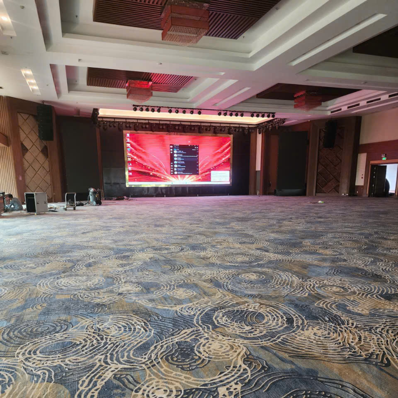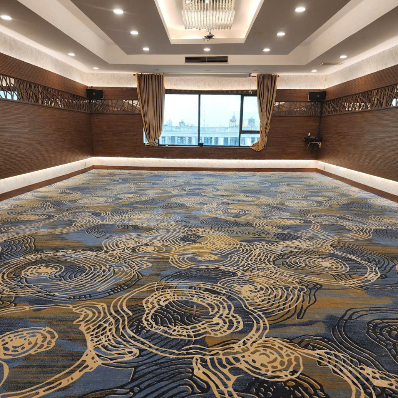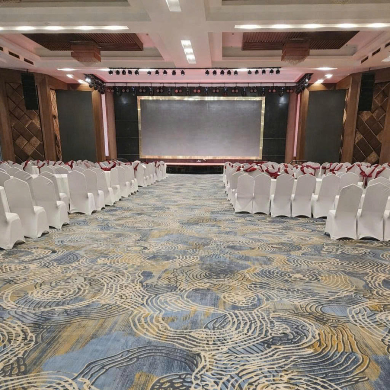 Loại thảm được lựa chọn sở hữu họa tiết xoắn nghệ thuật trên nền xanh – vàng, tạo hiệu ứng thị giác nổi bật, giúp không gian trở nên sinh động nhưng vẫn giữ được sự sang trọng cần thiết. Sự kết hợp giữa màu sắc thảm với hệ thống ghế và ánh sáng sân khấu tạo nên tổng thể hài hòa, chuyên nghiệp.