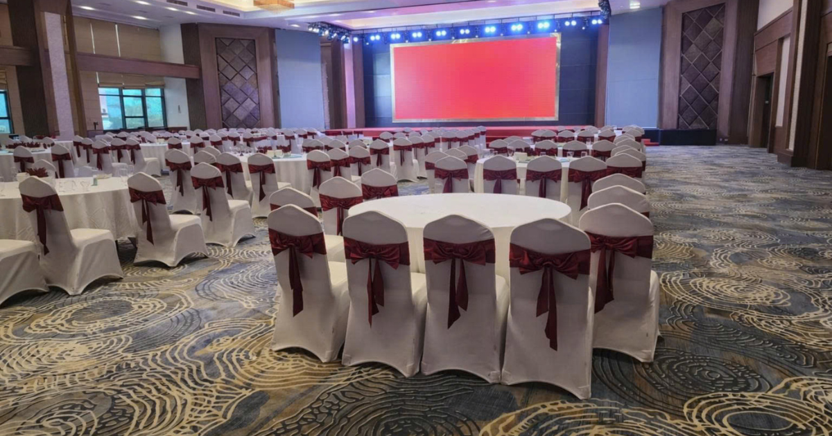 Không chỉ nổi bật về quy mô, khách sạn còn gây ấn tượng bởi hệ thống hội trường rộng lớn, được thiết kế sang trọng, phù hợp tổ chức hội nghị, hội thảo và tiệc cưới. Không gian được đầu tư đồng bộ từ ánh sáng, sân khấu đến nội thất, mang lại trải nghiệm đẳng cấp cho khách hàng khi tham dự các sự kiện tại đây.